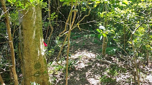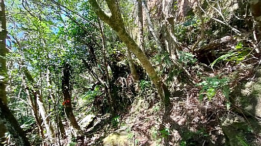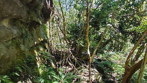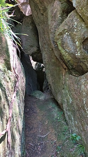 回到第二叉路,山路下稜轉腰繞,行於岩壁旁,路況仍佳。稍後右側岩洞與登頂前垂降路線會合,續往前。H367m |