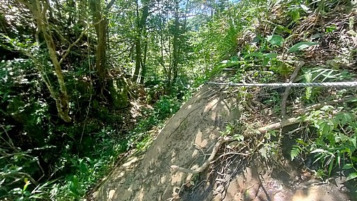 岩壁橫渡鞍部,續行稜線山路略往上。稍後再轉為連續攀繩陡下。H510m |