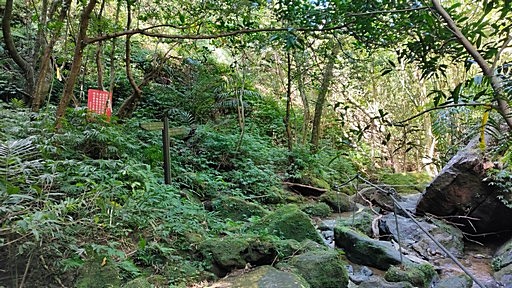 石燭尖叉路,直行較大條的步道往石燭尖,左側老舊的階梯往慈母峰。直行。水泥步道循溪往上游民宅。H215m |