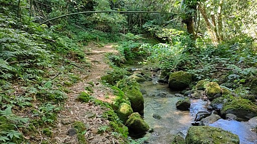 續行,踏攔沙壩淺水過溪。山路仍循溪往上游。 |