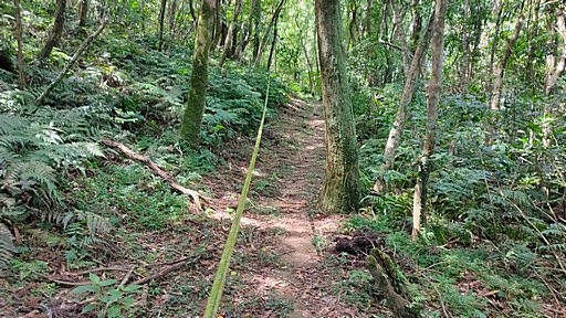 藤寮坑古道叉路,溪尾寮高分50電線桿,右下寬路為溪尾寮古道往張家莊,左為藤寮坑古道腰繞平緩好走,最終還是會接回溪尾寮古道,決定取右。H548m |