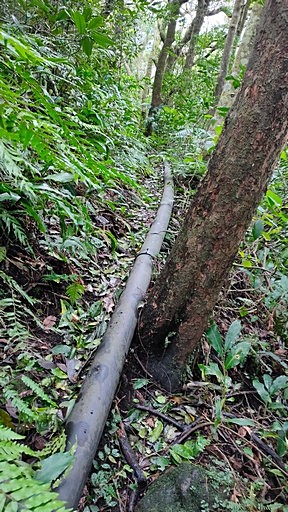 溪邊叉路,先遇右側過溪叉路往苗圃步道,再遇左側緩上叉路往冷苗步道,直行續往下。這一帶的山路路條極少,叉路口得仔細確認。不久出現黑色粗水管,水管路路況佳,有些地方路幅較狹小。H742m |
