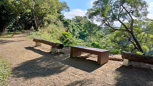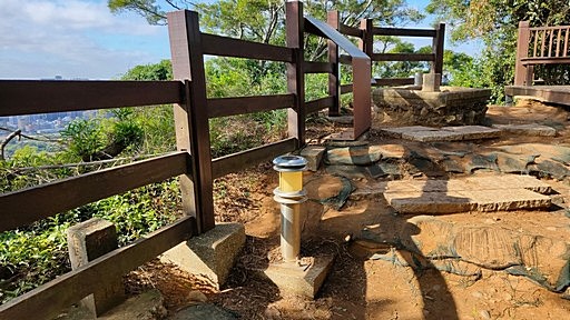 犁頭山,157m,三等三角點九七號、頭前溪水源保護區界11。山頂建有觀景台,展望極佳。右下步道往文山國小,直行為稜線山路往觀音廟。H154m |