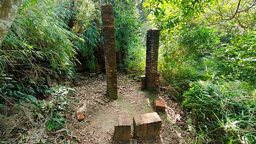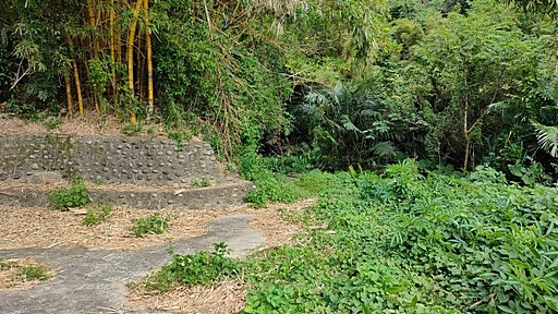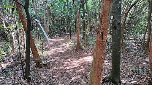 步道穿越水泥產道。早期的步道在附近下往產道再回稜,現今步道大都走在稜線上,比較單純。舊路的路跡或叉路仍在,大都無標示,選擇較明顯好走的新路即可。H165m |