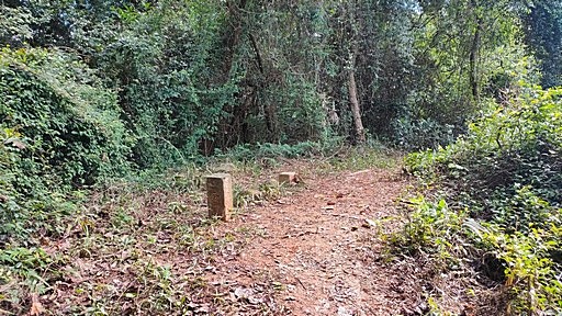 月桃窩古道鞍部,鞍部右下方有茶亭遺址,頭前溪水源保護區界12號水泥基石。右下為月桃窩古道往芎林水坑仔,續前行轉為水泥步道。H167m |