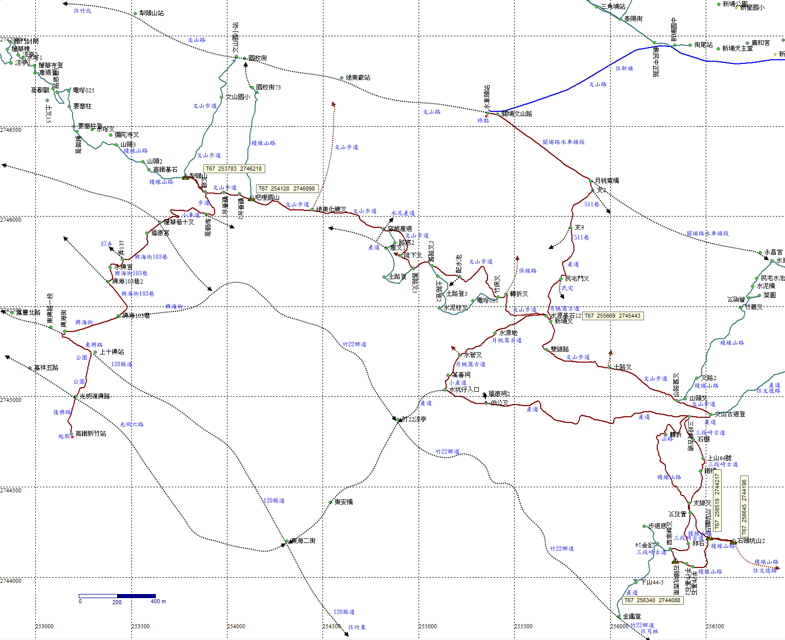 文山步道登山口,位於產道最高點,左往新埔,右往三段崎,取右。H165m |