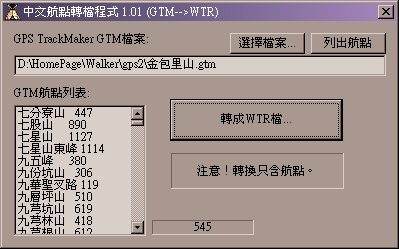 - 1.01 轉檔至GTM時,自動將航點名稱以英文或數字開頭的所有航點搬到最後面去,以避開GPS TrackMaker中文會變亂碼的問題。 [2010/9/20]