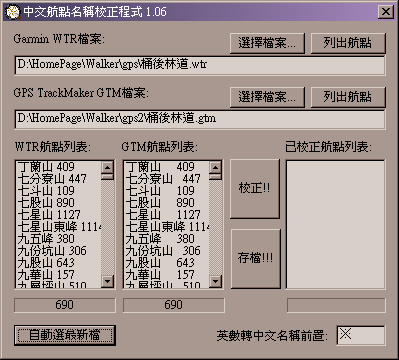 - 執行本程式,選定相同來源的.WTR檔與.GTM檔,然後進行[校正!!]。航點如完全校正成功,選[存檔!!!]則正確的中文航點會回存至原.GTM檔中。